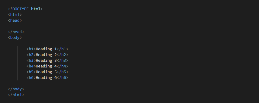 까지 구성되어있으며, 숫자가 작을 수록 중요함을 나타낸다. 사실 사이즈나 글꼴등은 나중에 다 변경가능해서 굳이 중요도를 나눌 필요가 있나 하겟지만 , 나중에 배울 시멘틱태그를 참고하면 중요할수록 숫자가 작은 제목태그를 사용해주는것이 좋으니 미리미리 습관을 들여놓는것이 좋다.
