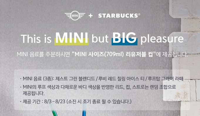 스타벅스 이벤트를 봤다. Mini 와 콜라보로 준비한 이벤트인데 미니 음료를 주문하면 리유저블컵을 준다는이벤트!